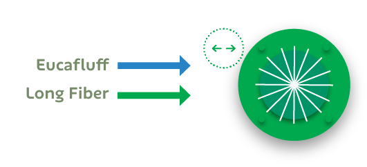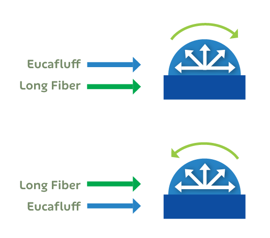 Eucafluff must always receive the last hit from the mill blade. It is necessary to pay attention to the axle rotation: if clockwise, the Eucafluff sheet needs to be placed on top of the long fiber sheet. In a counterclockwise direction, the Eucafluff sheet needs to be placed below the long fiber sheet.